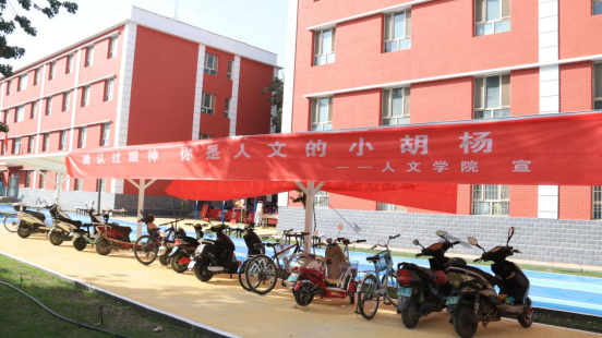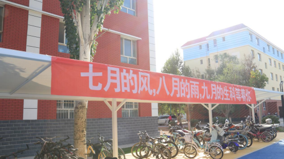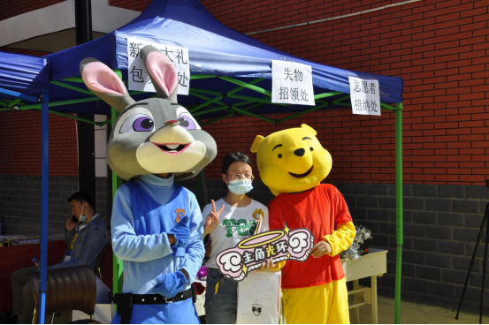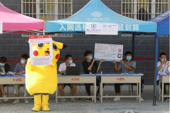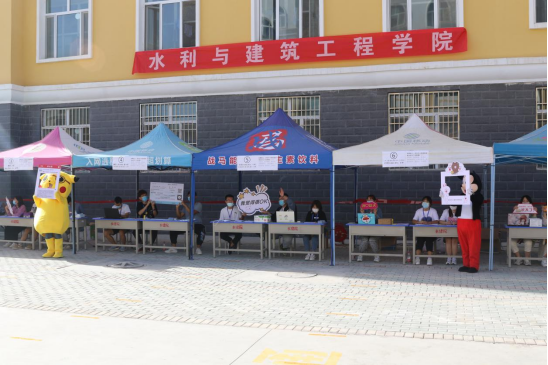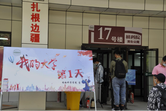 第四站:欢迎入住你的新家。宿舍楼前,标语、宣传墙、卡通玩偶、拍照板……特色鲜明的迎新宣传彰显学院风采,打造温馨家园。