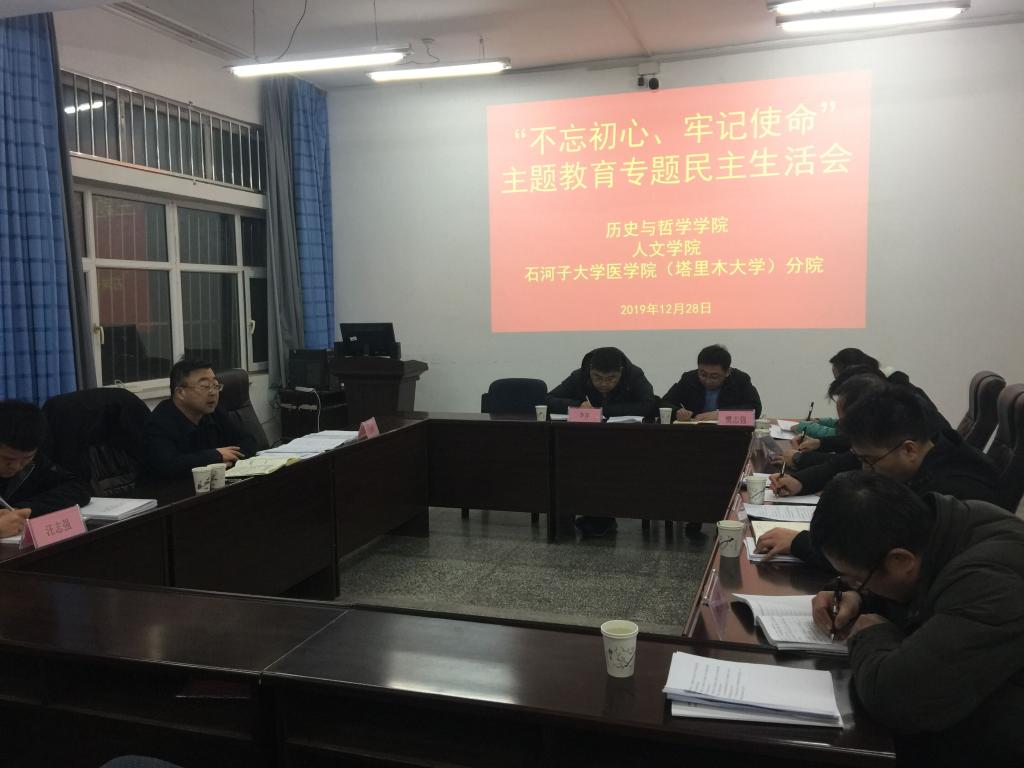根据学校党委关于“不忘初心、牢记使命”主题教育部署要求,12月28日下午,历史与哲学学院、人文学院、石河子大学医学院(beat365中文登录入口)分院三个学院党委(党总支)领导班子召开“不忘初心、牢记使命”主题教育专题民主生活会。学校主题教育领导小组第一指导组组长张理、成员汪志强,三个学院(党委)党总支领导班子成员参加。三个学院党总支委员、主题教育办成员列席。会议由校长助理、历史与哲学学院党总支书记、院长万朝林主持,在1号楼216会议室召开。