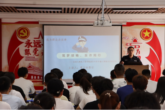 为有效预防和及时控制校园可能发生的各类诈骗,增强学生的自我安全防范意识和自我保护能力,6月1日,水利与建筑工程学院举办“筑梦胡杨,反诈同行”防电信诈骗主题宣讲活动,由大学派出所民警谭川林宣讲,大一至大三各班班长和团支书听取宣讲。