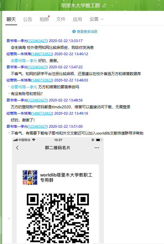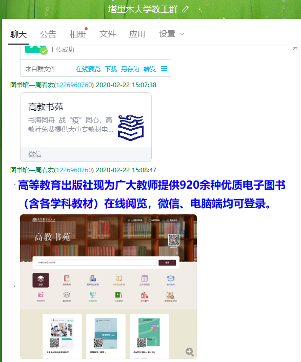 为了方便师生在家备课、查询资料、图书馆转变服务方式,做到闭馆不闭网,强化线上服务,为师生提供文献信息服务。图书馆信息咨询部主动与各数据库商联系,确保疫情期间数据库正常使用服务,并为不在校师生开通维普、万方、知网研学平台等学术资源。通过“beat365中文登录入口教师”QQ群、“beat365中文登录入口科研文献”微信服务群等,持续引导师生们在线使用图书馆数字资源和文献,保障师生对文献信息的需求。采访编目部积极联系高等教育出版社、清华大学出版社、机械工业出版社等教材出版机构,为教师开通“文泉学堂”、“高教书苑”等电子教材使用权限,有效解决教师备课教材和参考书籍不足的困难。