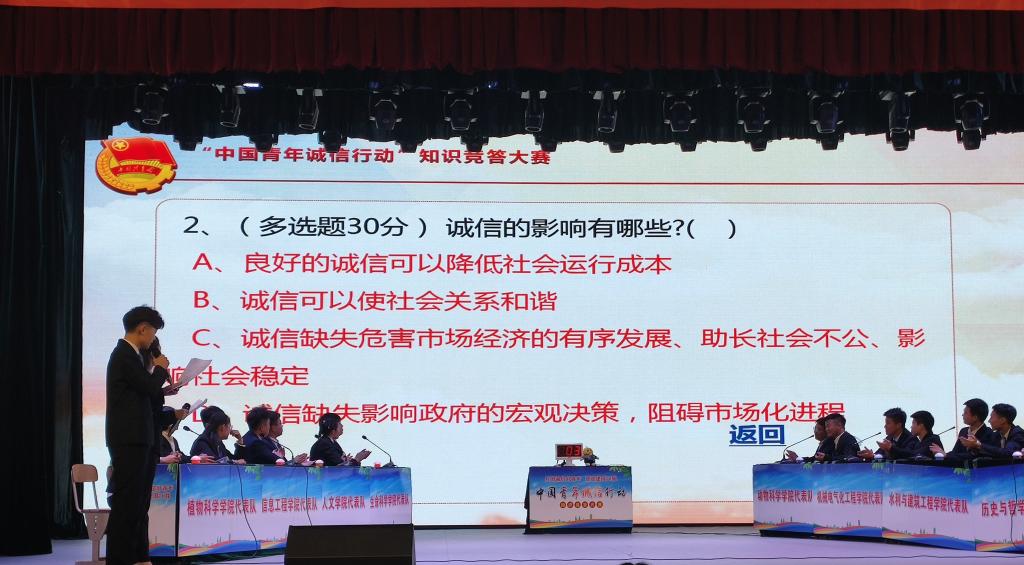 为拓宽诚信知识宣传的深度和广度,提升守信意识和风险防范能力,11月20日,由兵团团委主办的“中国青年诚信行动知识竞答大赛”,在beat365大学生活动中心举行,信息院获三等奖。