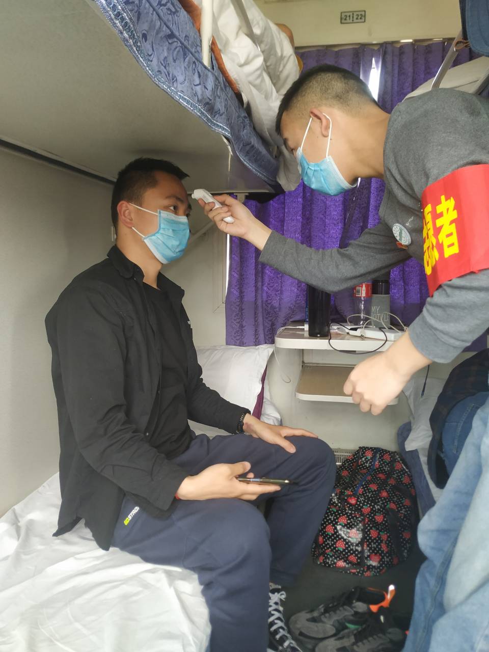 黄龙是机电院学生第二党支部党员,能够成为专列上的志愿者,他感到很满足。“疫情防控开始,每天在电视上看到志愿者们忙碌的身影,为他们的精神点赞,很遗憾没能成为他们中的一员。现在学校安排专列接我们回家,看到列车上需要志愿者的消息,我就第一个就报了名。”黄龙说。