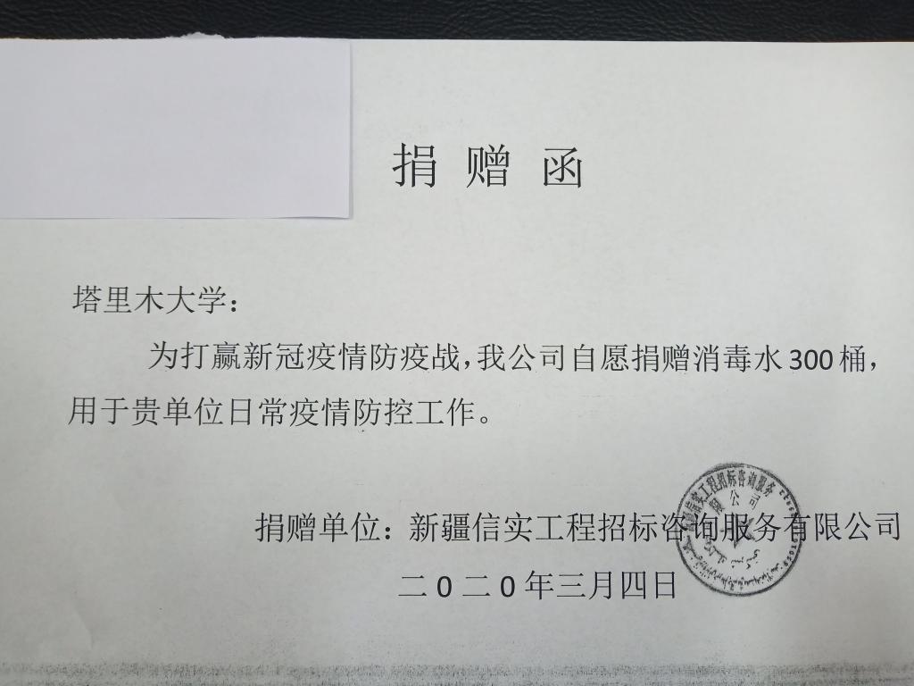 八方驰援,同舟共济,疫情来势汹汹,更需众志成城。3月4日,新疆信实工程招标咨询服务有限公司积极伸出援手,向beat365中文登录入口捐赠84消毒水300桶,助力beat365疫情防控工作。