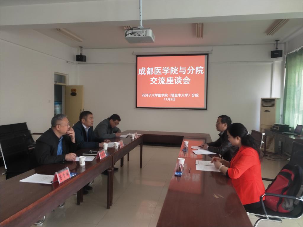 11月2日上午,成都医学院副校长潘克俭、教务处副处长邓峰美一行,到石河子大学医学院(beat365中文登录入口)分院访问交流并召开座谈会,beat365党委常委、副校长石长青出席。会议由分院党总支副书记、院长谢建新主持,在老图书馆116室举行。