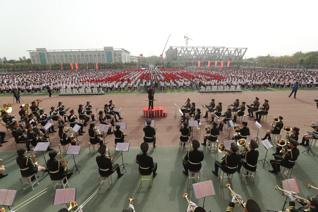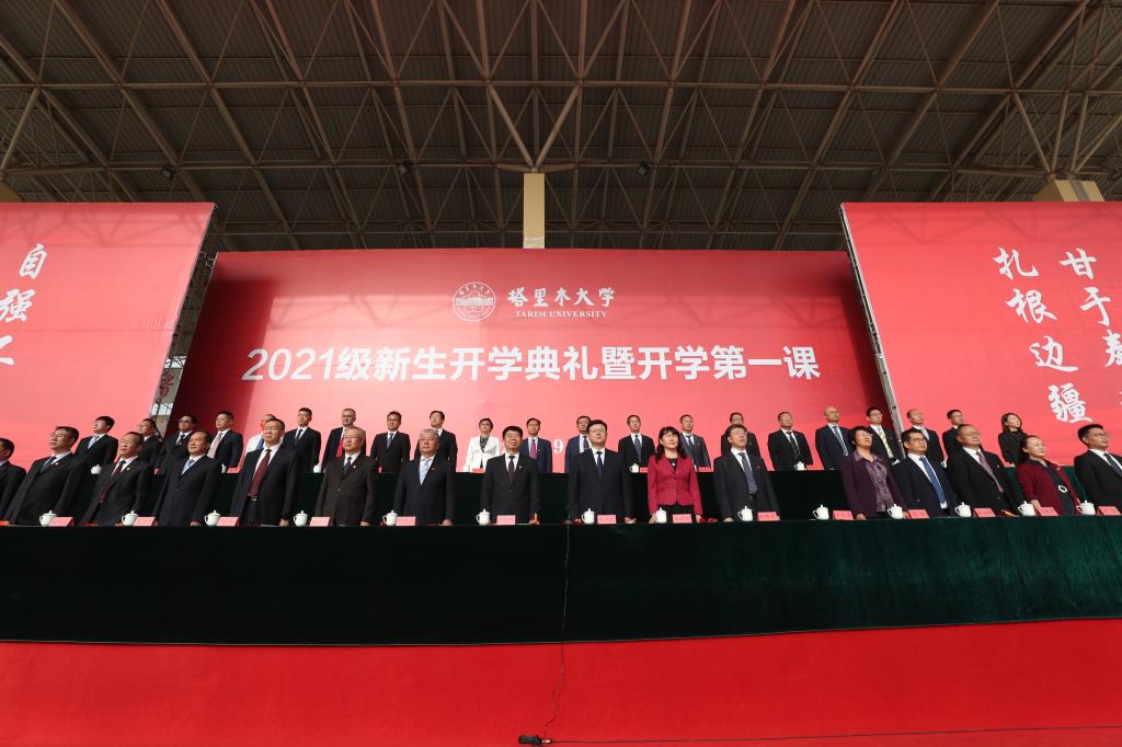 伴随着校歌《光荣塔大》,各学院学生代表走在排头,高举旗帜,迎风飘扬。校领导为新生代表佩戴校徽,学生代表献词《我的名字叫胡杨》。