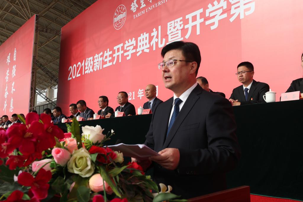 赵光辉讲话并做《开学第一课》,代表学校党委向全体怀揣梦想的新同学表示最热烈的欢迎,向精心培育他们的家长和老师们表示最衷心的感谢,并介绍了学校不平凡的建校历史、突出贡献、职责使命。他指出,在刚刚度过我们党百年华诞的伟大历史时刻,在两个一百年交汇的重大时间节点,今天我们迎来了7000多名朝气蓬勃的年轻人,你们是塔大的新成员、新力量、新希望。全体新同学要深思践悟,认真学习贯彻总书记“七一”重要讲话精神;知行合一,从百年党史的伟大成就中砥砺初心、担当使命;树牢家国情怀,赓续红色血脉、自觉传承和弘扬胡杨精神;不吃老本、再立新功,深入学习贯彻总书记重要批示精神。他强调,中国的未来属于青年,中华民族的未来也属于青年。我们要紧密团结在以习近平同志为核心的党中央周围,坚定理想信念,脚踏实地,发扬伟大建党精神,自觉践行胡杨精神和兵团精神,扎根边疆、奉献边疆,在实现中国梦的生动实践中放飞青春梦想,在新疆特别是南疆这个祖国最需要的地方让青春焕发绚丽光彩,在为实现人民美好生活向往的不懈奋斗中用青春书写华彩篇章。