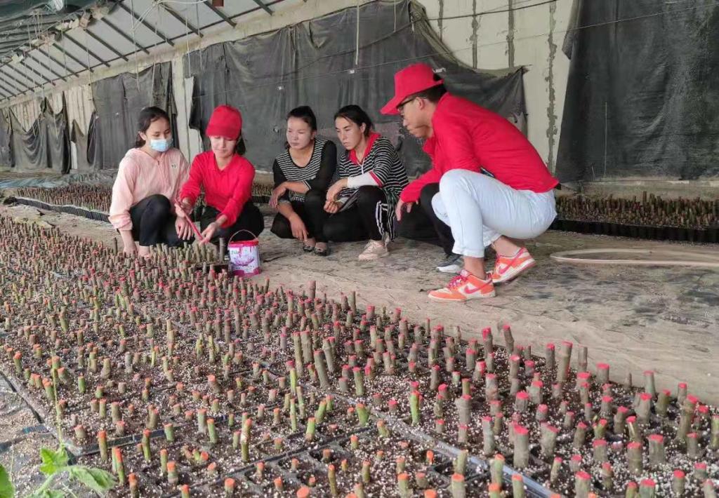 实践团在队长吾尔古丽的带领下,分别向农户讲解枝条怎么剪,怎么消毒,为什么要涂油漆,怎么涂,激素怎么配等技术要点。
