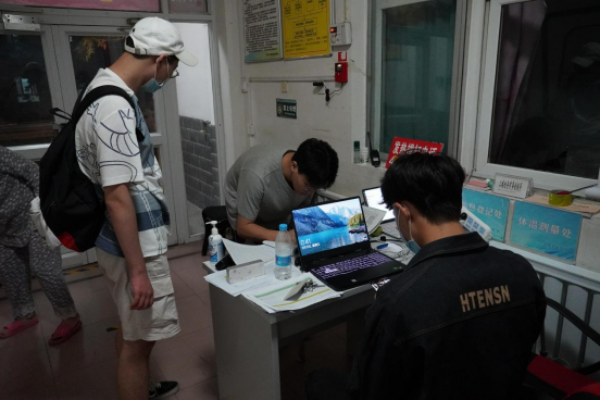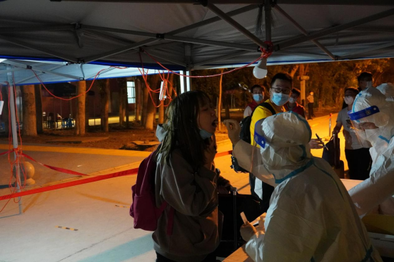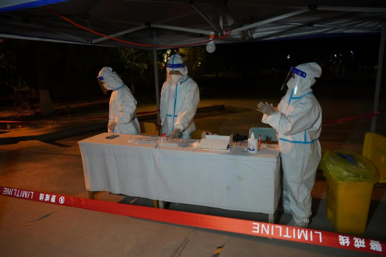 “这么晚,新生一定饿坏了,我们要抓紧时间,提高检测效率!”医护人员进行手部消毒,准备给新生采集核酸