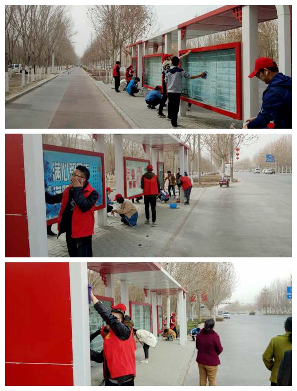 学习雷锋精神,创建文明家园。志愿者在阿拉尔市体育馆周边及金色家园附近公交亭打扫卫生