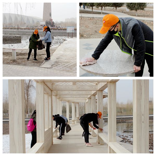 开展“信息学子学雷锋·服务清扫志愿行”活动,从大学路到阿拉尔游泳馆,志愿者清扫街道,擦洗公交站台等。