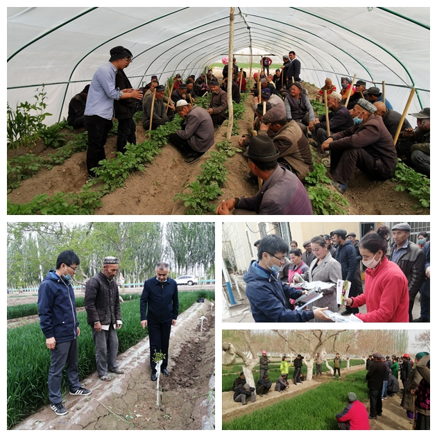 4月3日~4日7日,团队成员林敏娟、冯一峰和刘义飞3位老师赴英吉沙县包孜洪村开展科技服务。在“访惠聚”工作队的带领下,就杏树栽培过程中花期管理和水肥调控、整形修剪、病虫害防治技术、设施马铃薯和设施草莓栽培管理技术进行了现场培训。
