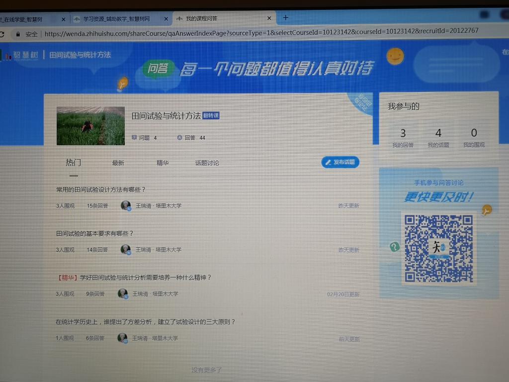 为最大限度减少疫情对教学进度和学习效果的影响,按照学校部署要求,植科院结合实际,认真组织在线教学工作。王瑞清老师在和田皮山农场,承担的网课是《田间试验与统计方法》。她督促授课班级农学22-1班40名同学积极入班,给学生分享课堂学习资源。进行直播课试课,练习上课签到、学生弹幕提问、随机点名等课堂互动操作。修改完善课件PPT,设计上传题库。