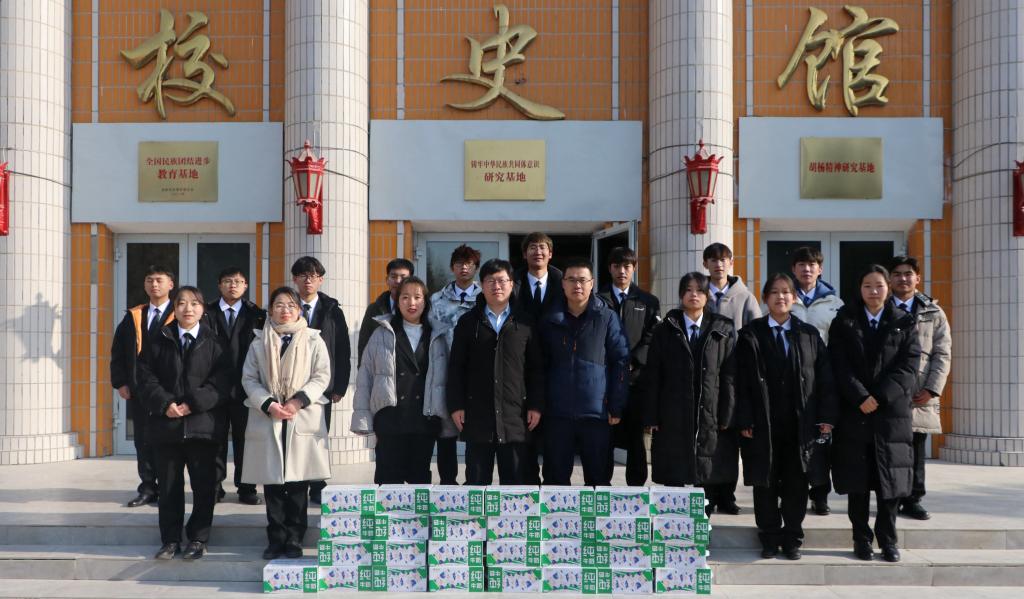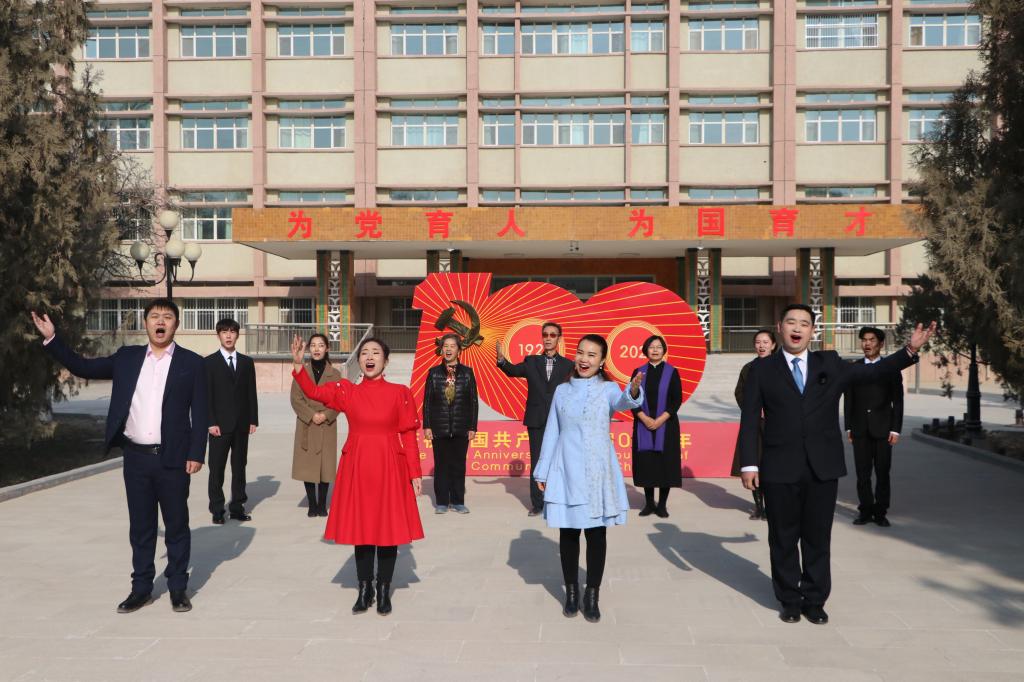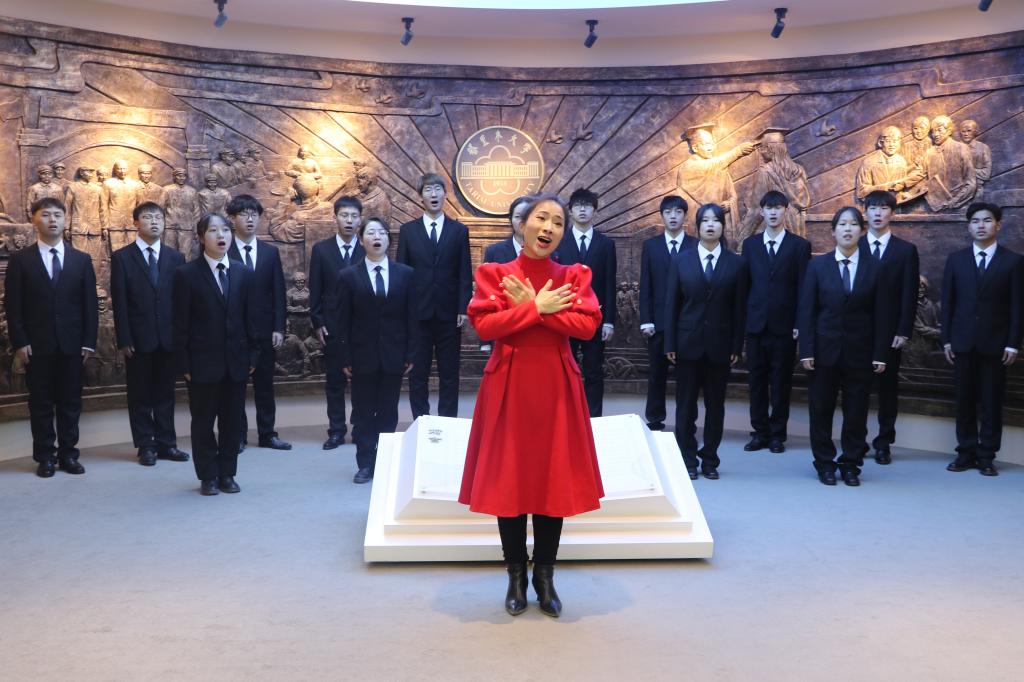 隆冬时节,霜花漫天。在校史馆前,师生们挥舞着手里的小红旗,唱响不忘初心永远跟党走的坚定信心和真挚情怀,凝聚实现中华民族伟大复兴中国梦的磅礴力量。