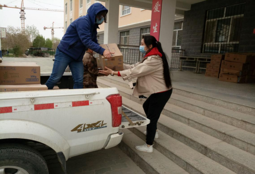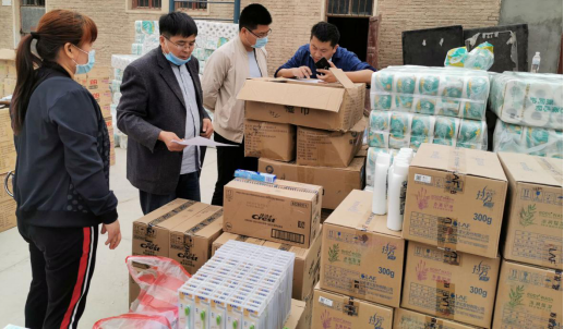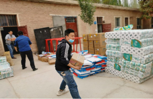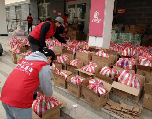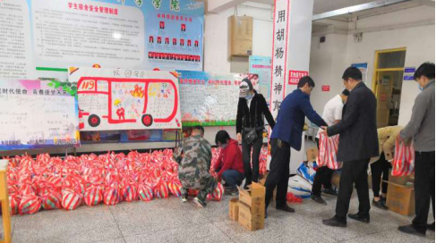老师们组成生产流水线,递肥皂、纸巾、放东西,将洗漱生活用品等12件套打包成套装,最后打包成袋子。