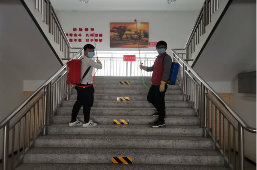 老师们背着20公斤的喷雾器在学生公寓内消杀