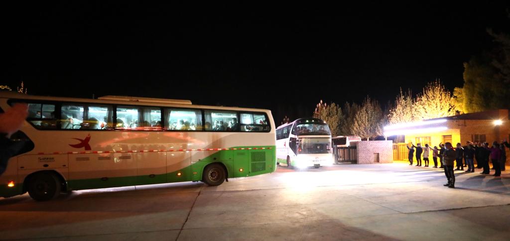 凌晨2:00,载着1086名返校胡杨学子的大巴车,缓缓驶进学校正南门,同学们坐在车上不停地,向站在大门口等待的领导干部们挥手示意。