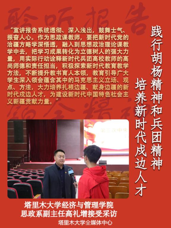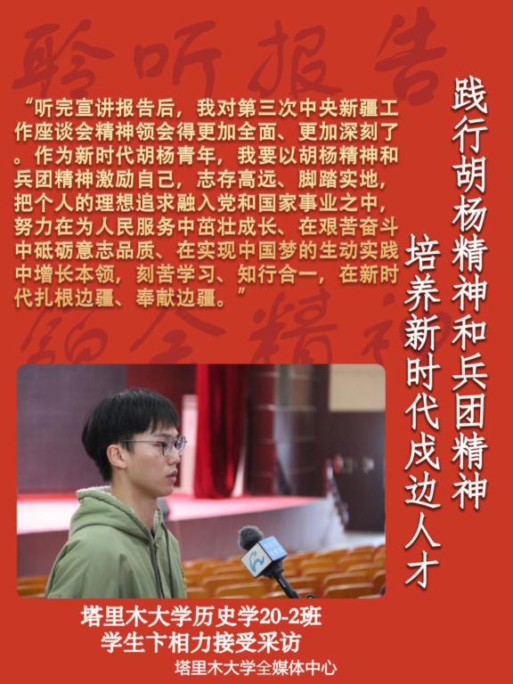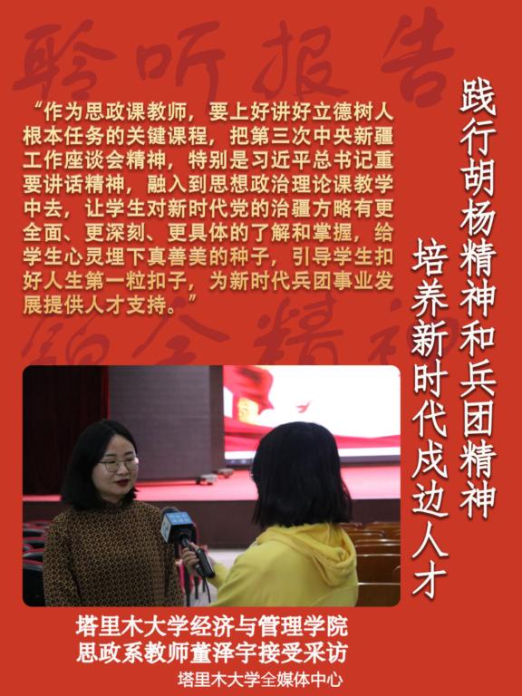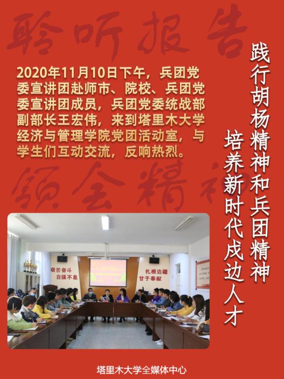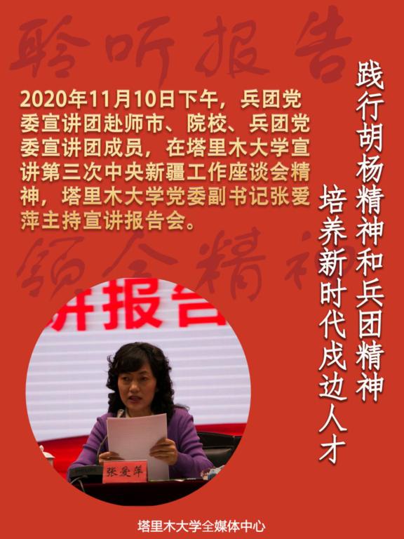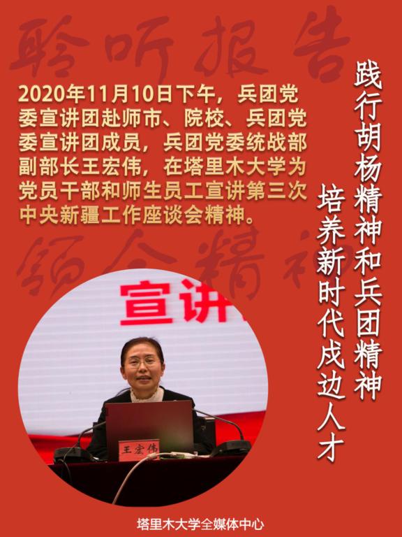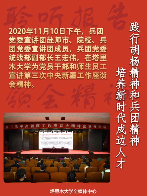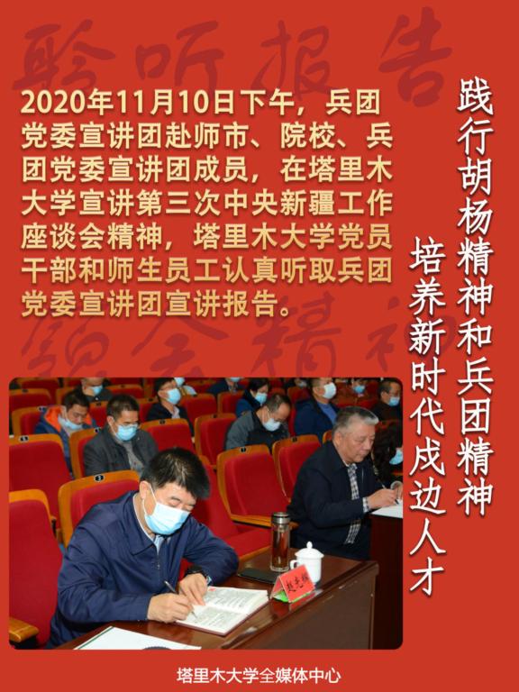 为深入学习宣传贯彻第三次中央新疆工作座谈会精神,特别是习近平总书记重要讲话精神,根据兵团党委统一部署,11月10日,第三次中央新疆工作座谈会精神兵团党委宣讲团赴师市、院校、兵团机关宣讲分团在beat365中文登录入口开展宣讲活动,并与党员干部和师生员工互动交流。党员干部和师生们聆听了宣讲报告后表示,要联系实际学、持续跟进学、融会贯通学,切实把学习成果转化为提高认识、改进工作的强大动力和实际成效。