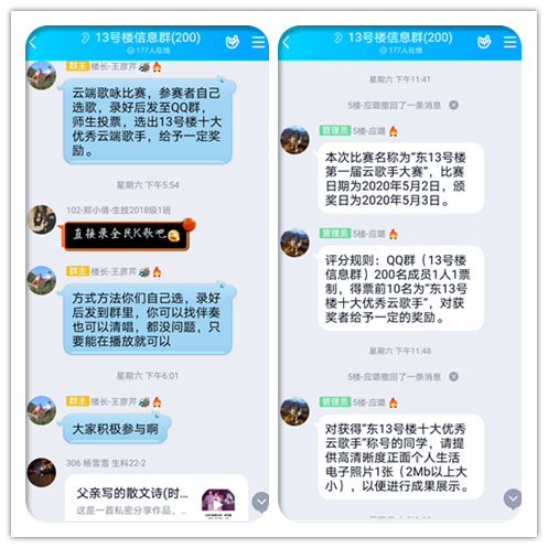 本次大赛同学们踊跃参与,通过制作“全民K歌”上传至QQ群,参赛作品也风格迥异、争奇斗艳,无不彰显着青春的活力和感恩的色彩。本次大赛最终由老师、同学通过群投票的方式选举产生“东13号楼十大优秀云歌手”。尤其值得一提的是冠军选手——318宿舍集体合唱《和你一样》,她们来自不同的专业和班级,十几天前才刚刚成为舍友,这是团结的音符,是友谊的曲调。
