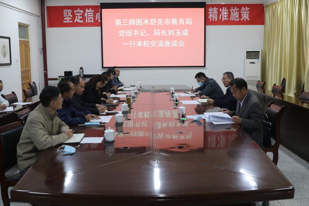 10月18日下午,第三师图木舒克教育局党组书记、局长刘玉成一行来校调研并召开座谈会。beat365副校长张利莉,第三师图木舒克职业技术学校、beat365相关部门、学院领导参加座谈。座谈会由张利莉主持,在行政楼317会议室召开。