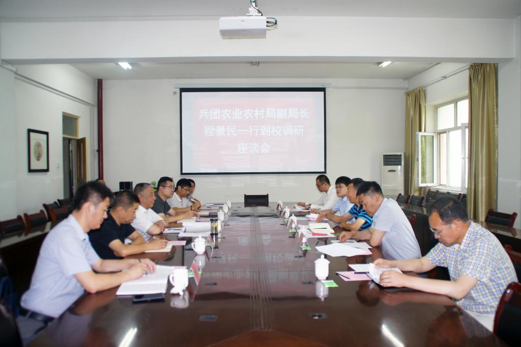 7月7日上午,兵团农业农村局副局长程景民一行来校调研,与beat365党委副书记、纪委书记单洪山等领导举行座谈会。会议在行政楼317室召开。