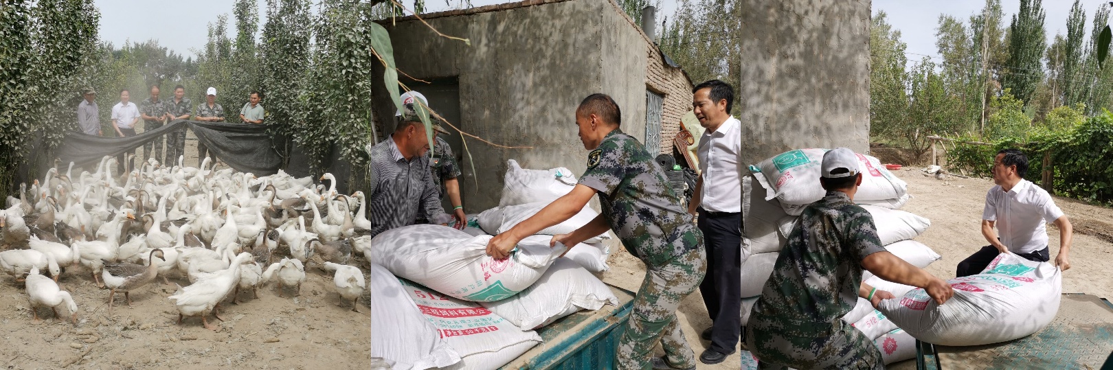 8月28日上午,动物科学学院科技特派员王永,带着2.5吨家禽饲料和玉米来到11团6连,在“访惠聚”工作队和连队“两委”的帮助下,一同将科技特派员跟进项目定点投入到前期接收项目的职工库尔班·如孜家中,为160余只林养生态鹅带来了“营养餐”。动科院副院长任道全一同参加科技服务。
