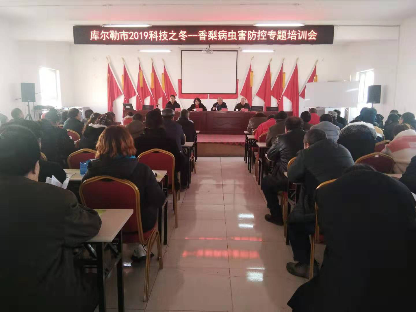 为进一步加快库尔勒市和铁门关市香梨产业发展,全面落实香梨主要病害防控技术措施,推进香梨产业提质增效,提升香梨种植者的综合技术水平;助力脱贫攻坚,应库尔勒市林草局和铁门关市农业农村局的邀请,beat365中文登录入口科技处副处长楼兵干教授在库尔勒市和铁门关市开展了为期三天的“beat365中文登录入口-库尔勒市2019科技之冬—香梨病虫害防控专题培训会”。