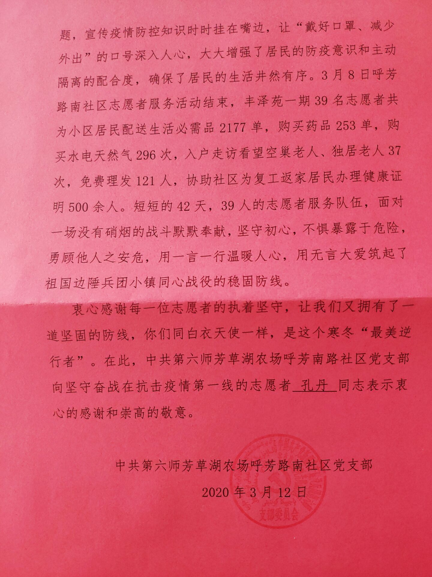 坚守初心,不惧危险。孔丹等39名志愿者以坚定的信念站好了当地社区疫情防控的每一班岗,力争成为社区防疫一线的生力军,他们展示了青年一代的风采,更是胡杨精神的真实写照。广大青年学生应该学习孔丹同志的先进事迹,舍小家、顾大家,积极培养爱国情怀和奉献精神。(文/马倩倩 摄/呼芳路南社区工作人员)