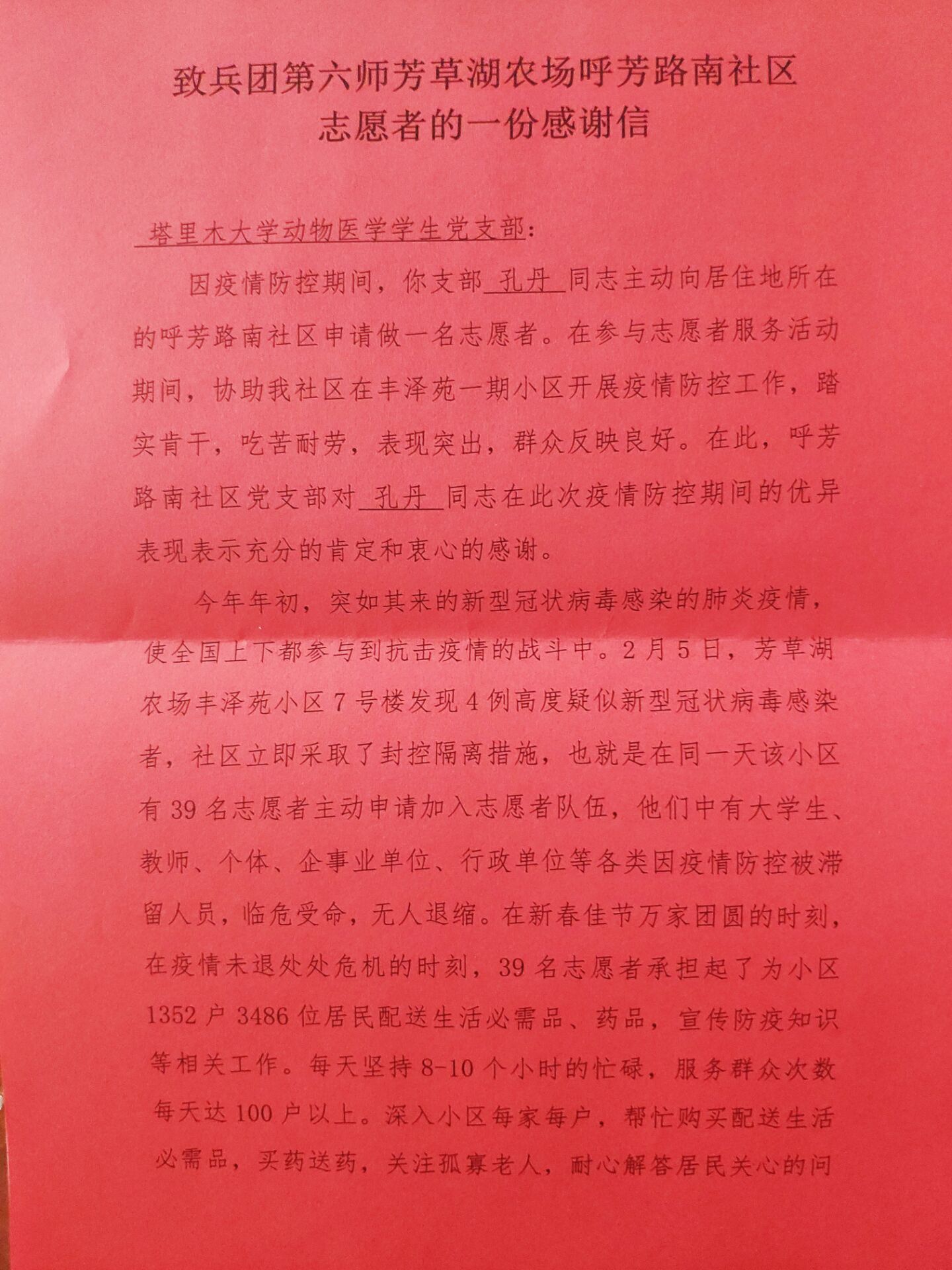 3月12日,beat365中文登录入口动物医学学生党支部收到来自第六师芳草湖农场呼芳路南社区党支部对学生党员孔丹等志愿者的感谢信,信中表