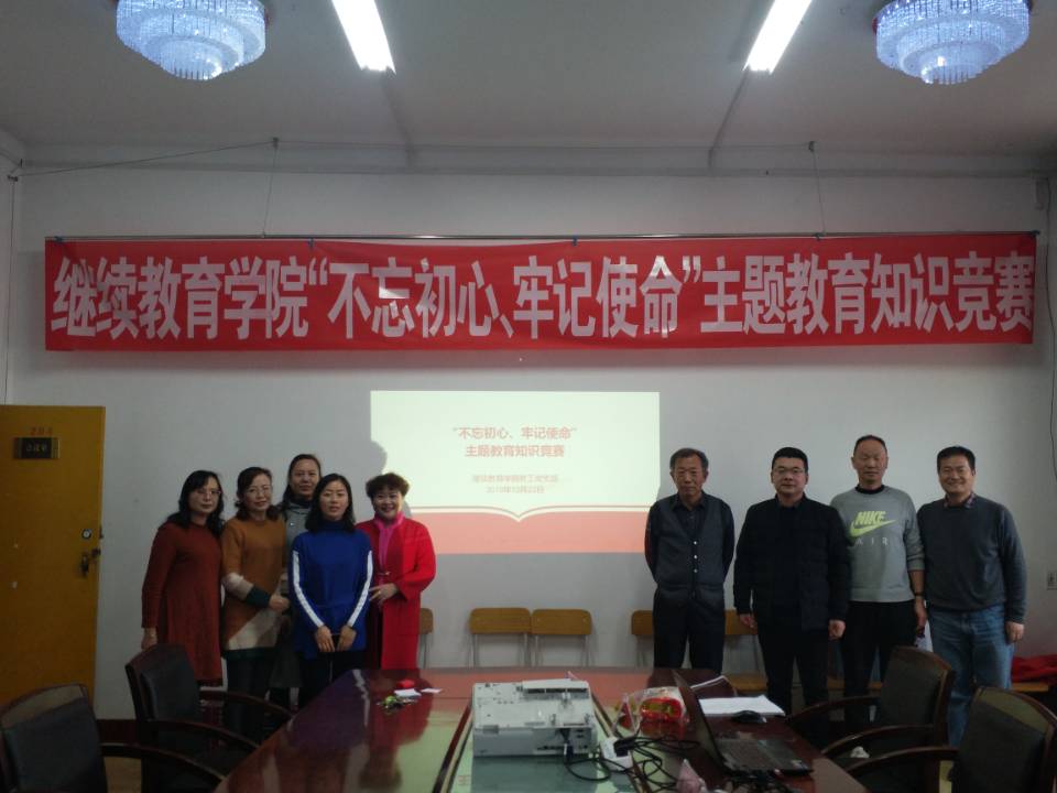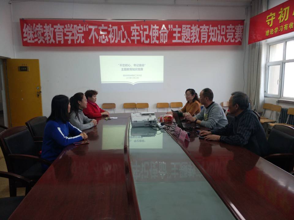 继续教育学院党总支响应学校党委关于深入推进“不忘初心、牢记使命”主题教育,持续抓好理论武装,坚定理想信念,强化党性修养,确保理论学习有收获、思想政治受洗礼、干事创业敢担当、为民服务解难题、清正廉洁作表率。学院党总支于12月22日下午,在1号教学楼204会议室举办“不忘初心、牢记使命”主题教育知识竞赛。