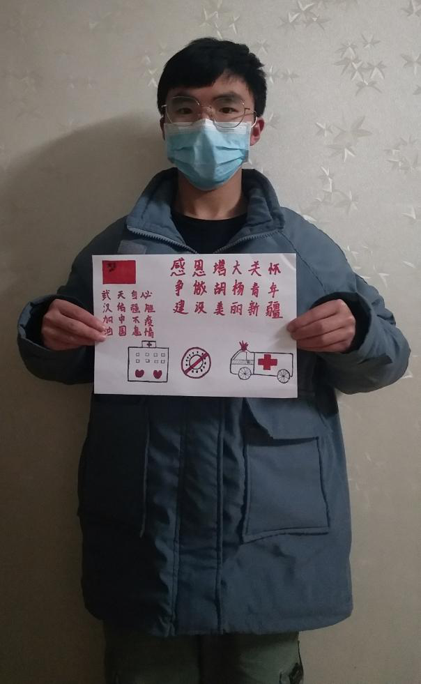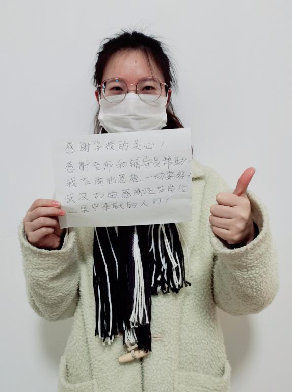 非常感谢学校对我的关心,在这个特殊时期,学校即使远在新疆却仍然心系我们湖北籍学子,还送来了慰问金。辅导员老师更是常常与我视频通话牵挂着我的安全,我感到非常温暖和幸福。对此,我想说感谢学校,感谢老师,有你们的关心和帮助,我们一定能克服困难,战胜疫情!湖北加油!中国加油!