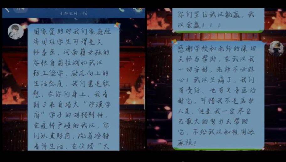 身在疫情重灾区的我,看着不断滚动的疫情新闻忐忑不安时,我的学校,塔大,尽己所能帮助我们湖北籍学生缓解经济上的压力。学校和学院领导、班主任、辅导员老师的电话问候和关心;还有专门为湖北籍学子给予困难补助,如此种种对于我来说无异于雪中送炭,让我和家人的心,都感到无比温暖。感谢塔大对我的关心,您的心意我收到了,我一定会坚强面对疫情,与祖国共度难关,等待春暖花开,清风徐来,在今后的路上我也会更加勇敢,带着您的这份心意披荆斩棘,不忘初心,做一名新时代戍边人。