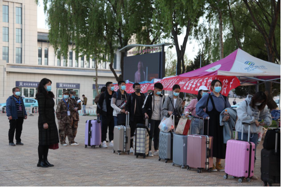 疆外返校学生下了火车,张莉莉上前与同学们亲切交谈,热烈欢迎同学们回家。叮嘱同学们要积极配合学校,做好个人防护,认真学好网课,安排好校园生活。