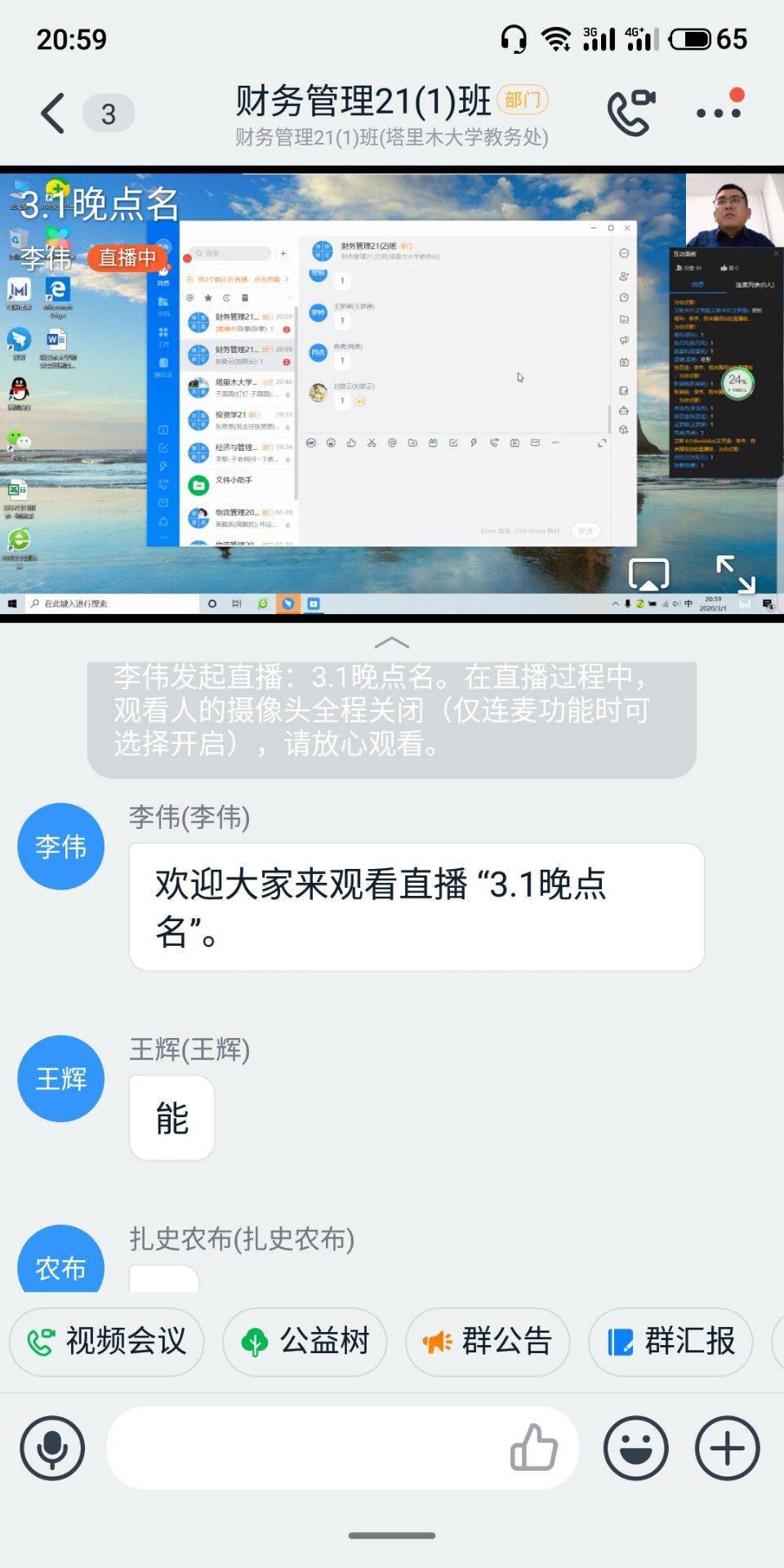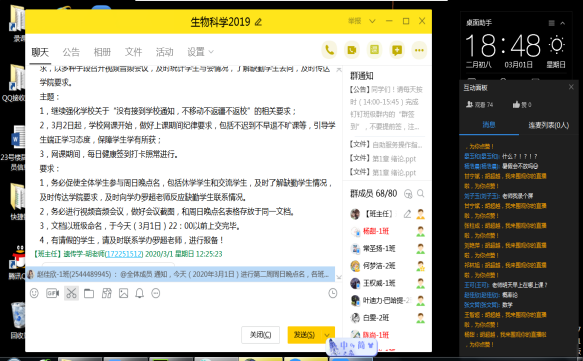 辅导员、班主任充分发挥作用,经过精心设计组织,根据班级实际情况,通过钉钉、QQ,微信等平台开展周日晚点名。积极了解学生思想动态,引导学生做好个人防护,增强他们战胜疫情的信心决心,督促学生停课不停学,严格执行请销假制度,做好线上思想教育及管理工作。