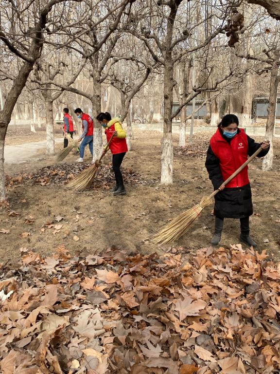 线下志愿服务活动中,志愿者身穿红色志愿者服,在综合楼周边清扫校园环境卫生,清理教学区残枝落叶、卫生死角。青年志愿者们不怕脏、不怕累,发扬雷锋精神,传承胡杨精神,为营造干净、整洁的校园环境发挥着自己的光和热。