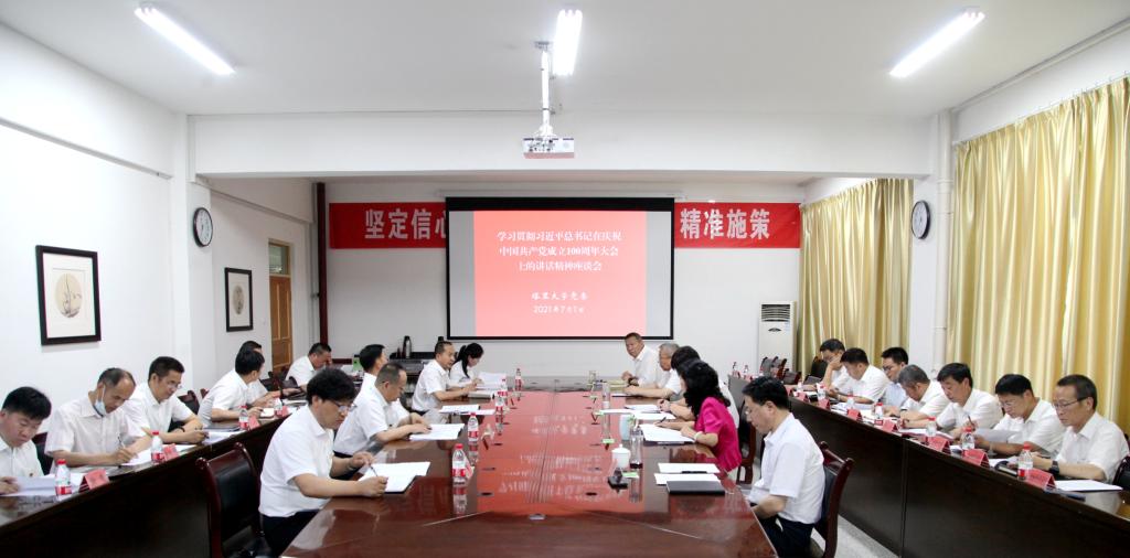 7月1日上午,庆祝中国共产党成立100周年大会结束后,学校党委迅速组织召开座谈会,围绕总书记在庆祝中国共产党成立100周年大会上重要讲话精神展开深入学习研讨。党委副书记、校长张传辉,党委副书记张爱萍,党委常委、副校长、赵峰华、于军,以及各基层党委(党总支)、各部门主要负责同志、党员干部和教师党员代表参加会议。会议由张爱萍主持,在行政楼317会议室召开。