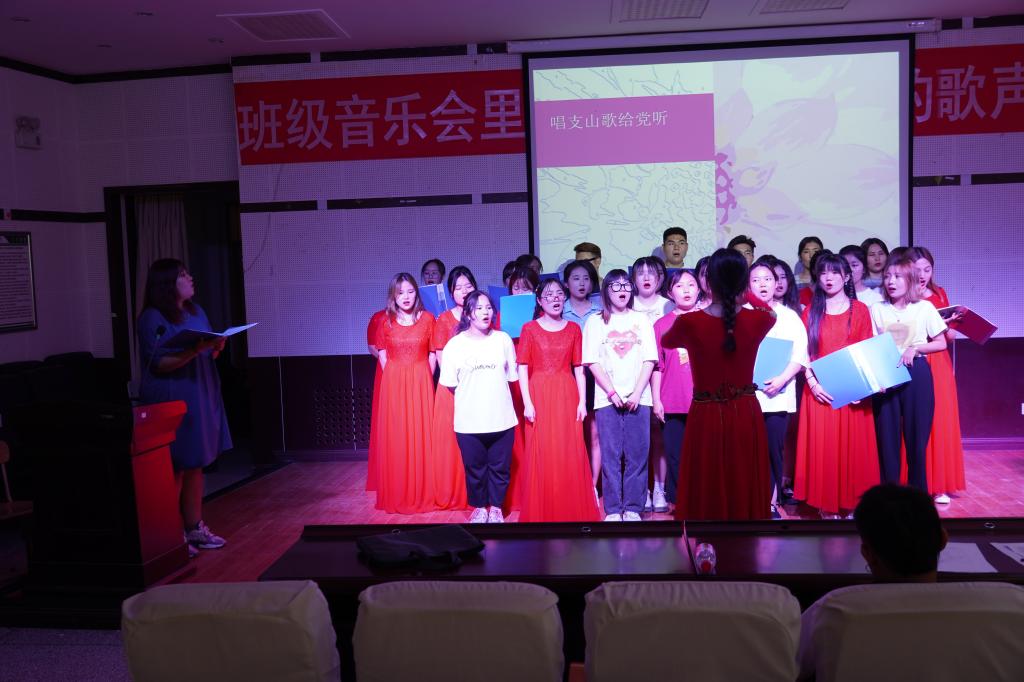 6月22日下午,在文科楼B座117音乐室,由学前教育2019级全体同学带来的“最美的歌声献给党——班级音乐会”正在举行。同学们讲解了不同时期、不同体裁的红色经典歌曲并用对唱、轮唱、小组唱、合唱的形式歌唱了不同年代的红色经典歌曲:《光荣塔大》《大红枣儿甜又香》《南泥湾》《二月里来》《劳动更光荣》《学习雷锋好榜样》《映山红》《五月鲜花》《春晓》《清明》《青年友谊圆舞曲》《萱花草》《党啊亲爱的妈妈》《唱支山歌给党听》。