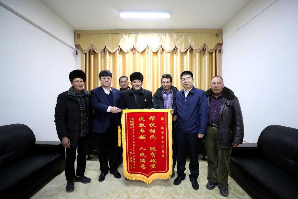 1月6日,麦盖提县克孜勒阿瓦提乡代尔瓦孜库木村党员代表捧着一面绣着“帮扶村民,脱贫攻坚,成效卓越,人民满意”16字锦旗送到beat365中文登录入口。