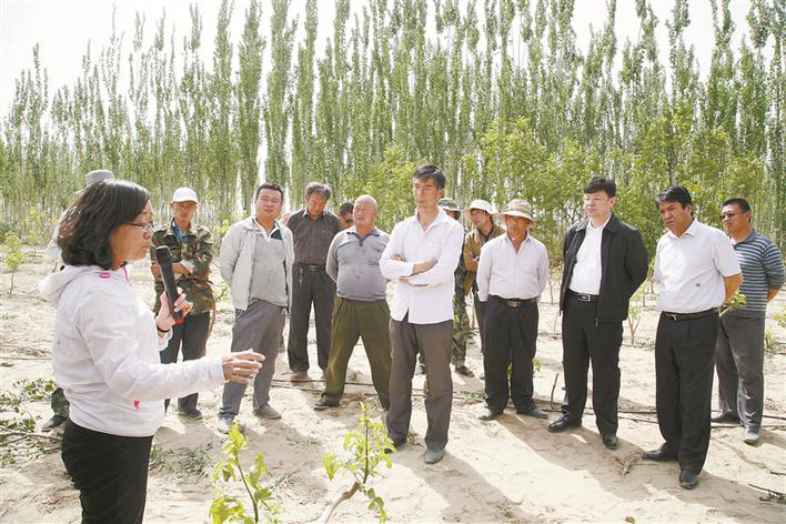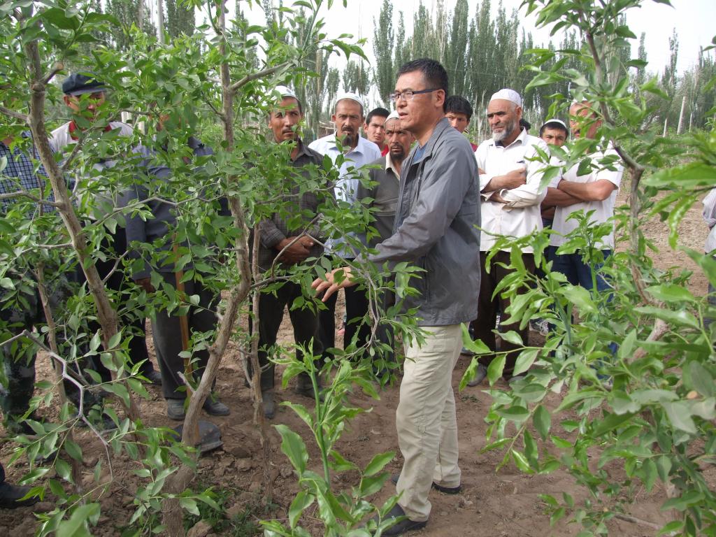 beat365中文登录入口果树专家、教授王新建(前中)给三师五十一团六连职工群众讲解灰枣树修剪方法(资料图片)。