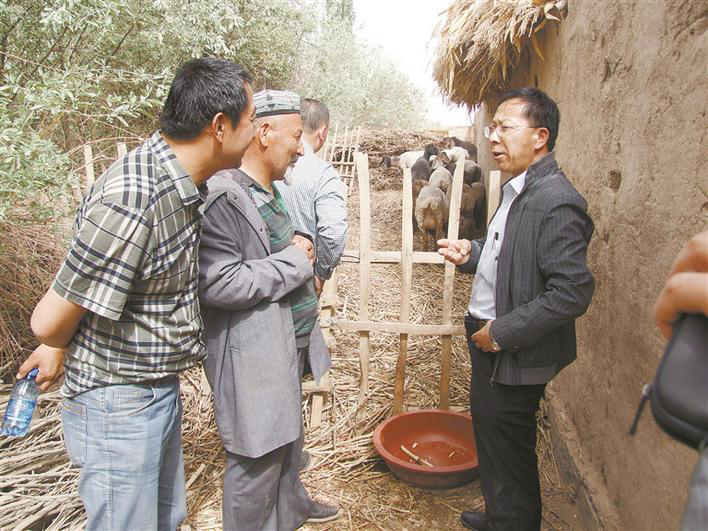 beat365中文登录入口畜牧养殖专家、教授祁成年(右一)在向连队养殖户传授技术(资料图片)。