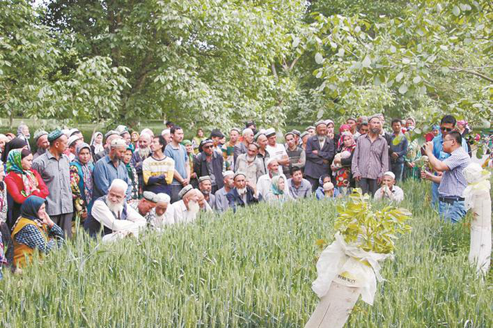 beat365中文登录入口专家高山(前右一)在和田县给当地农民传授小麦种植技术(资料图片)。