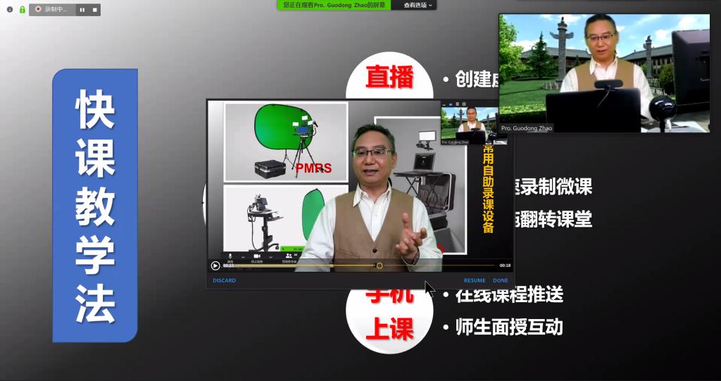 赵国栋教授借助交互式虚拟直播技术,以当前国际上流行的快课技术常用工具文字语音转换、动漫助教设计、手绘视频制作、PMRS自助录课和手机交互等软件为依托,以体验互动的形式,使beat365教师身临其境地体验到“快课技术”这种新教学法的独到之处,用数小时时间快速将自己的课程上网并向学生们推送,实现在线教学。