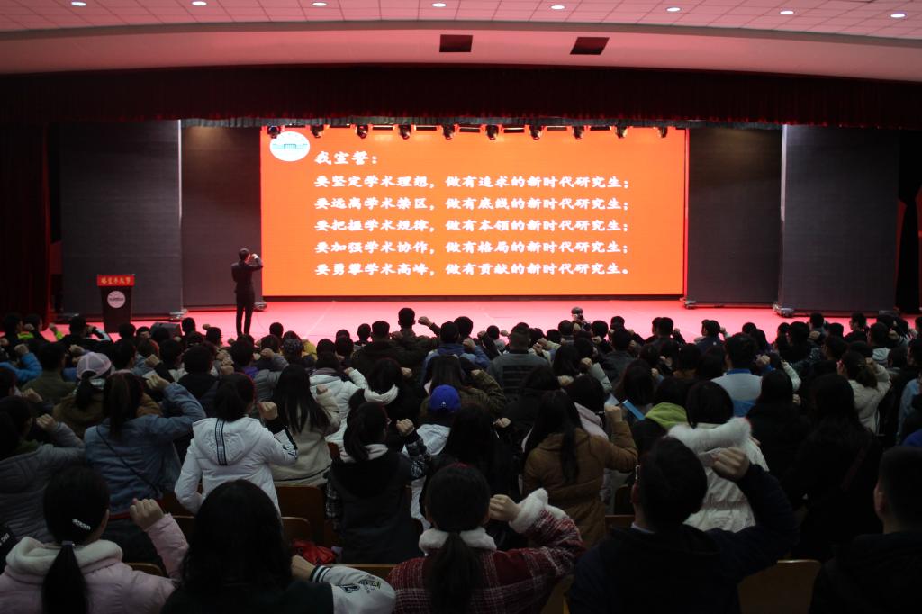 报告会后,研究生集体宣读了由50所高校研究生会共同发布的《践行优良学风,做砥砺奋斗的新时代研究生——面向高校研究生的学风倡议书》。全体研究生宣誓表示,要坚定学术理想、远离学术禁区、把握学术规律、加强学术协作、勇攀学术高峰,勇于砥砺奋斗,为祖国繁荣、人民幸福、民族复兴、人类进步贡献青年力量。