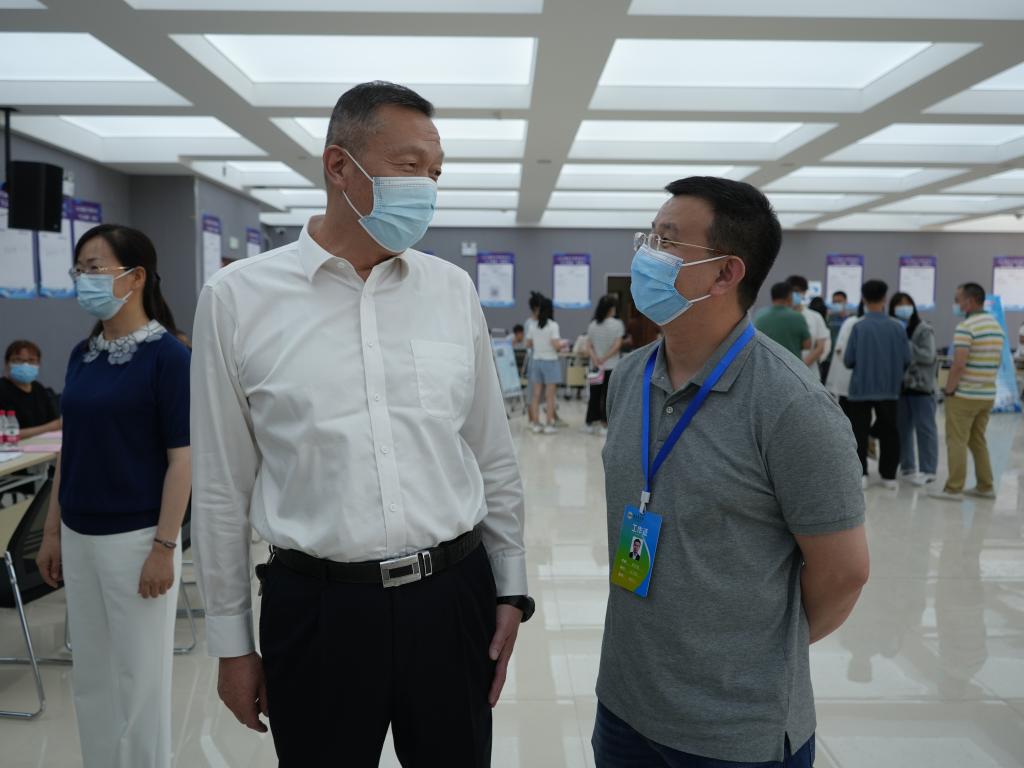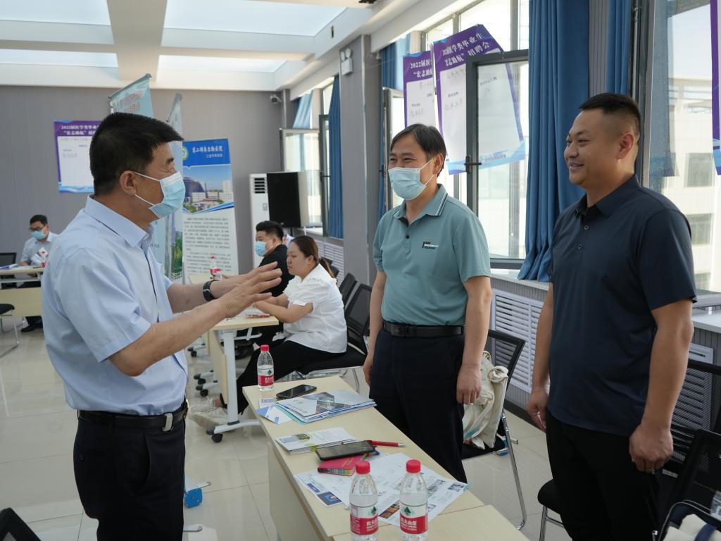 5月18日,医学院在医科楼报告厅举办2022届毕业生“宏志助航”专场招聘会。党委书记赵光辉,党委副书记、校长张爱萍,党委常委、副校长于军,党委常委、副校长石长青来到招聘会现场检查指导工作。