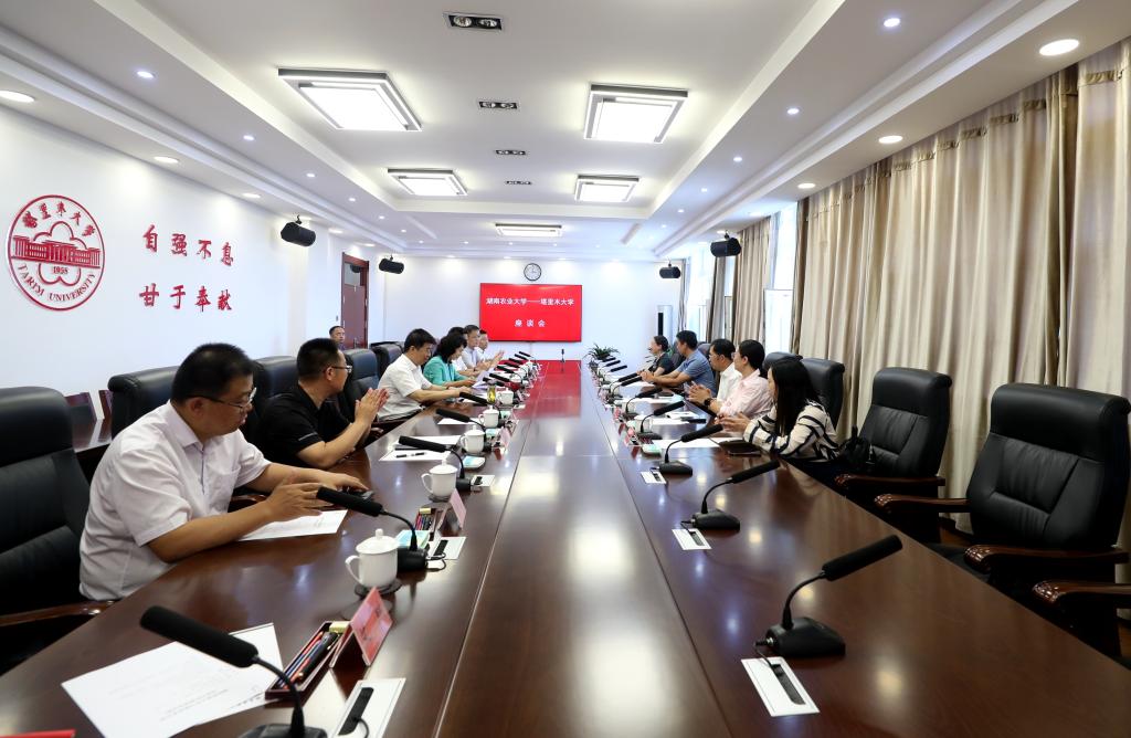 8月3日,湖南农业大学党委副书记、校长、中国工程院院士邹学校一行来校访问,受到beat365党委书记赵光辉,党委副书记、校长张爱萍,党委常委、副校长石长青等领导的热情接待,并召开座谈会。湖南农业大学党委副书记段美娟,湖南省蔬菜研究所郑井元研究员,以及两校相关部门、学院领导参加。座谈会由张爱萍主持,在行政楼315会议室召开。