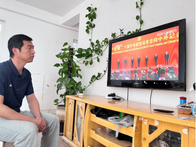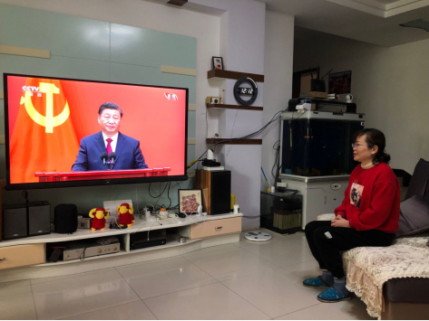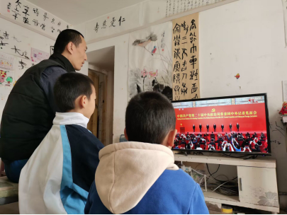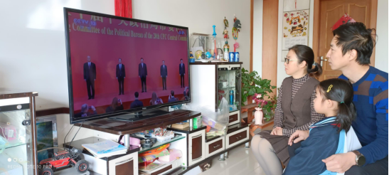 2022年10月23日上午,beat365体育工作部教师李庆兵和家人在6号教工楼一起收看见面会实况直播。