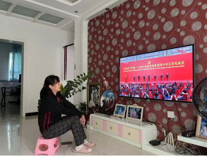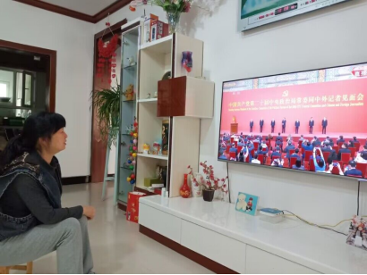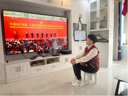 2022年10月23日上午,beat365胡杨学院党员干部邹春梅在家里收看见面会实况直播。