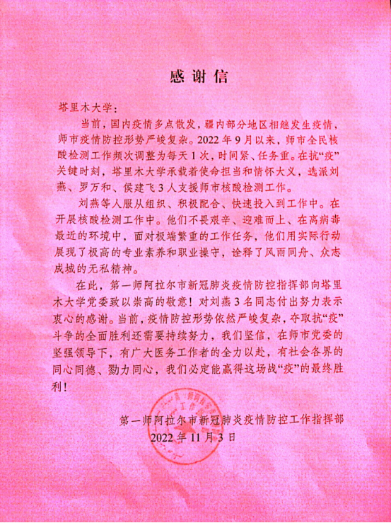 刘燕、罗万和、侯建飞3位教师主动报名参加师市疫情防控工作。“报名的那一刻,我就做好了一切准备,有信心战胜一切困难!”刘燕激动地说。学校收到了师市疫情防控指挥部发来的感谢信,赞扬了3位教师的认真负责和无私奉献的良好表现。