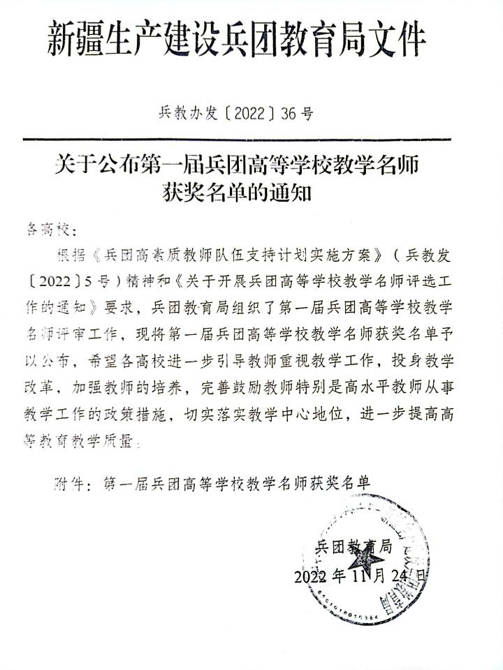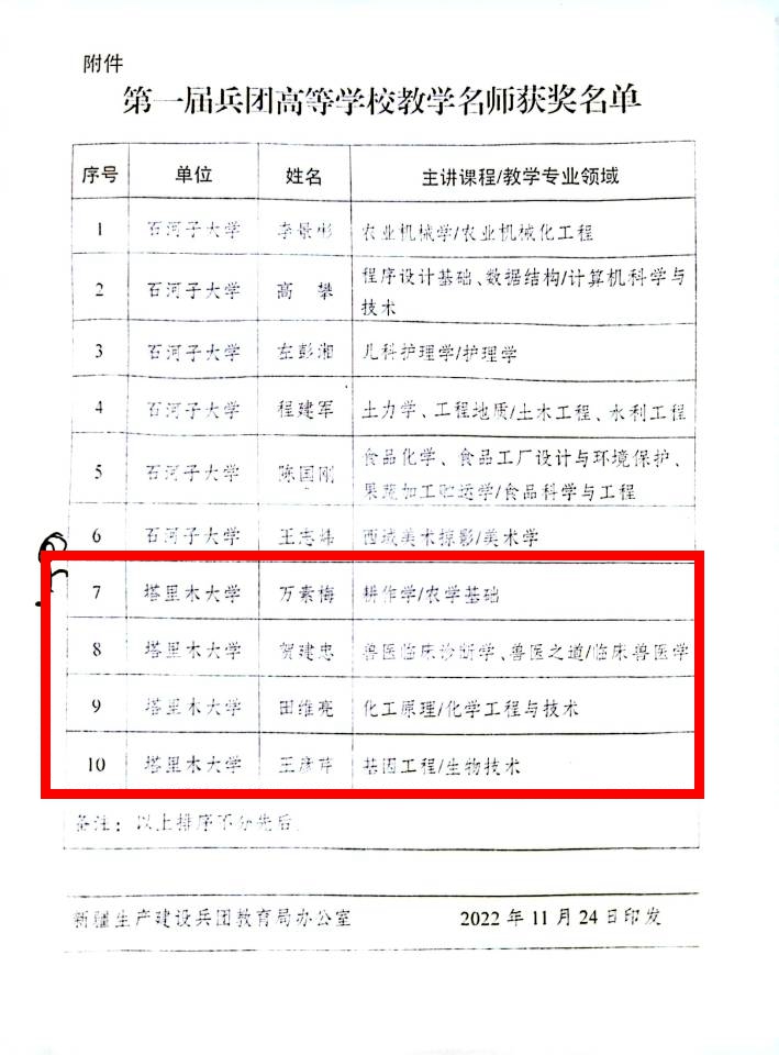 近日,兵团教育局公布了第一届兵团高等学校教学名师获奖名单。beat365农学院万素梅教授、动物科学与技术学院贺建忠教授、化学化工学院田维亮教授、生命科学与技术学院王彦芹教授喜获第一届兵团高等学校教学名师。至此,学校获省级教学名师人数累计达到9名。