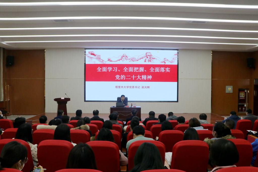 赵光辉以“全面学习、全面把握、全面落实党的二十大精神”为题,从充分认识党的二十大召开的重大意义、深刻理解党的二十大精神的主要内容与核心要义 、学校贯彻落实习近平新时代中国特色社会主义思想所取得的成效、让党的二十大精神在beat365中文登录入口生根发芽、开花结果四个方面,结合学校实际和自身学习体会,对党的二十大精神进行了全面深刻的解读。