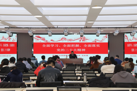 2022年11月30日下午,党委常委、副校长石长青为医学院、图书馆、体育工作部宣讲党的二十大精神。医学院党委副书记胡斌主持宣讲报告。